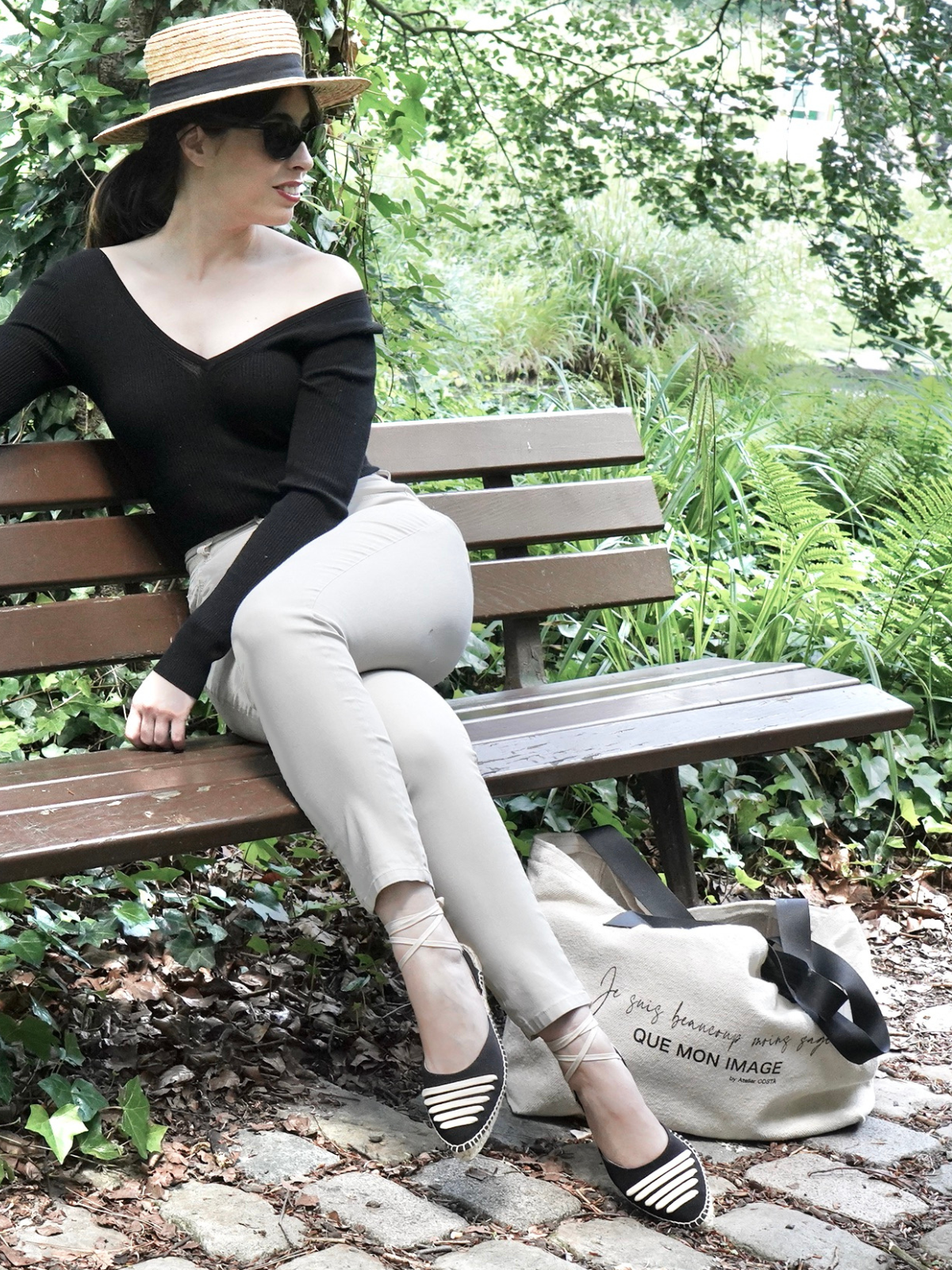Noé es una alpargata plana de mujer confeccionada en lona negra de alta calidad, con clásicas cintas cruzadas color blanco crudo para atar al tobillo. Su diseño artesanal hecho en España y su suela de yute flexible ofrecen una comodidad fresca ideal para el verano.